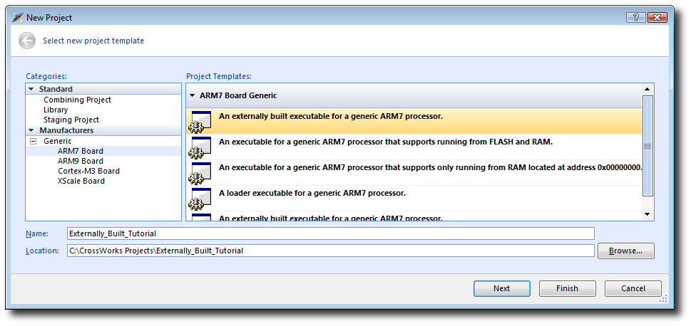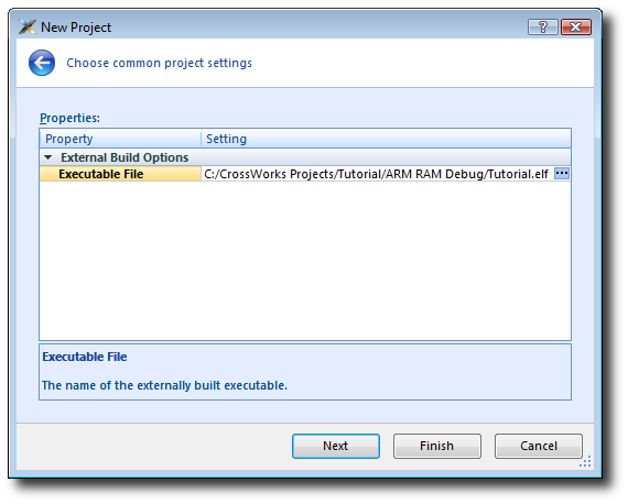 In the Executable File field, type the path to the Tutorial.elf executable file we generated earlier. For example, if the project was created in the C:/CrossWorks Projects/Tutorial directory and was built using the ARM RAM Debug configuration, the path to the executable file will be C:/CrossWorks Projects/Tutorial/ARM RAM Debug/Tutorial.elf.