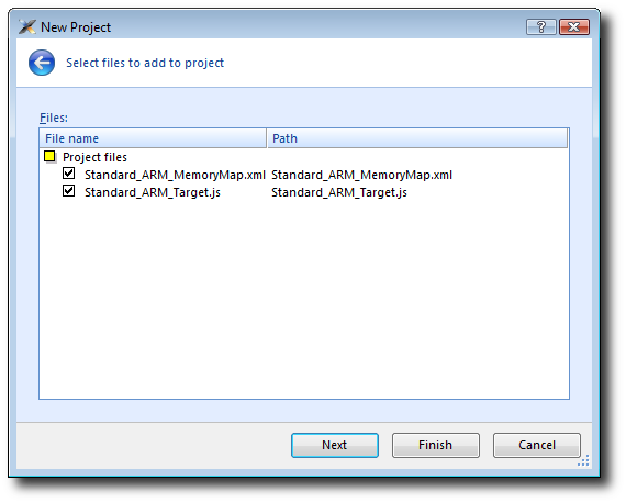 The Project files group shows the files that will be copied into the project. The only files used are the memory map file, which describes the memory layout used by the application, and the script used to reset and control the target. For the debugging session to work correctly, each of these files must match and be appropriate for the application you are debugging.
