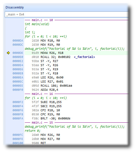 The Disassembly window can be used to debug your program at the instruction level. It displays a disassembly of the instructions around the currently located instruction, interleaved with the source code of the program, if the source is available. When the Disassembly window has focus, all single-stepping is done one instruction at a time. This window also allows you to set breakpoints by clicking in the gutter of lines containing instructions on which you want to set a breakpoint.