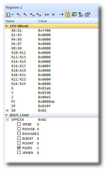 You can also use the registers window to display peripheral registers. To display the state of the target's bootloader registers, select BOOT_LOAD from the Register Groups menu.