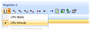 The Registers window can be used to view CPU and peripheral registers. First we shall look at just the CPU registers. To do this, use the Registers 1 window's Register Groups menu to select CPU (Word).