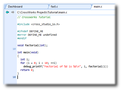 We can open a file for editing by double-clicking the node in the Project Explorer. For example, double-clicking fact.c opens it in the code editor: