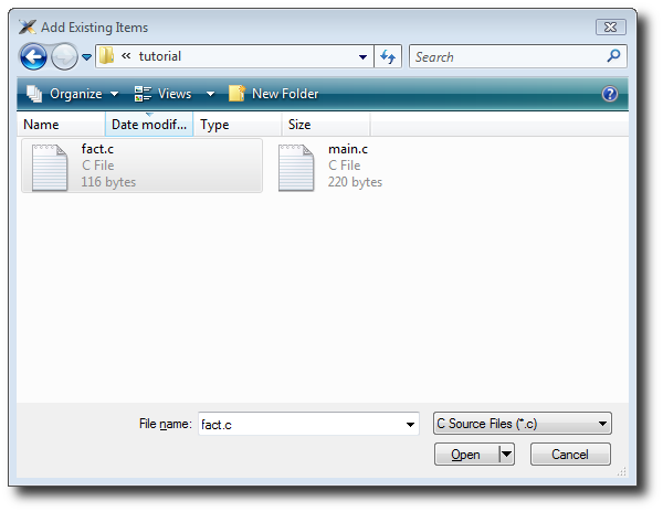 Click Open to add the file to the project. The Project Explorer will list fact.c in the Project Items' Source Files folder, with a shortcut arrow because the file is not in the project's home directory. Rather than edit the file in the tutorial directory, we'll put a copy of it into the project's home directory: