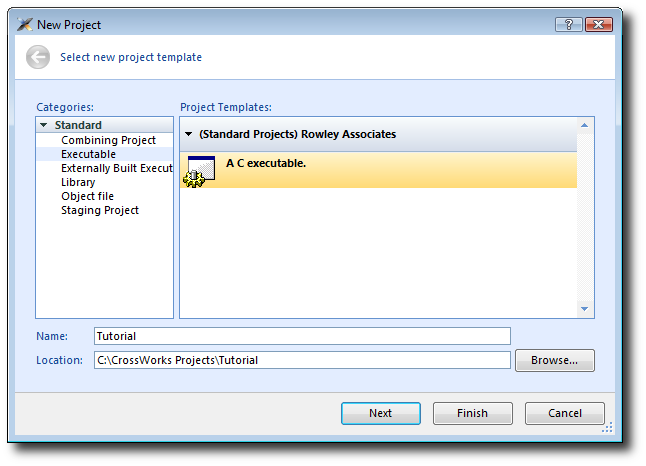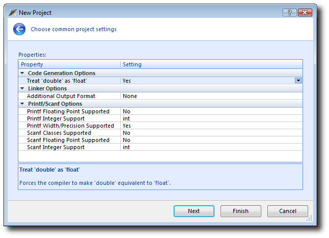Here you can customize the project by altering a number of common project properties, such as an additional file format to be output when the application is linked and what library support to include if you use printf and scanf. After the project is created, you can change these settings in the Project Explorer as needed.