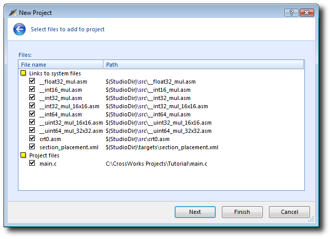 The Links to system files group shows the links to CrossStudio system files that will be created in the project. Because these files are links, the default behavior is that they will be shared with other projects—so modifying one will affect all projects containing similar links. To prevent accidental modification, these files are created as read-only. Should you wish to modify a shared file without affecting other projects, first import it into the project. (Importing a shared file will be demonstrated later in this tutorial.) See Creating and managing projects for more information on project links.
