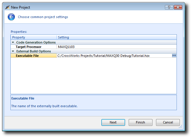 In the Executable File field, type the path to the Tutorial.hzx executable file we generated earlier. For example, if the project was created in the C:/CrossWorks Projects/Tutorial directory and was built using the MAXQ30 Debug configuration, the path to the executable file will be C:/CrossWorks Projects/Tutorial/MAXQ30 Debug/Tutorial.hzx.