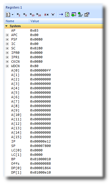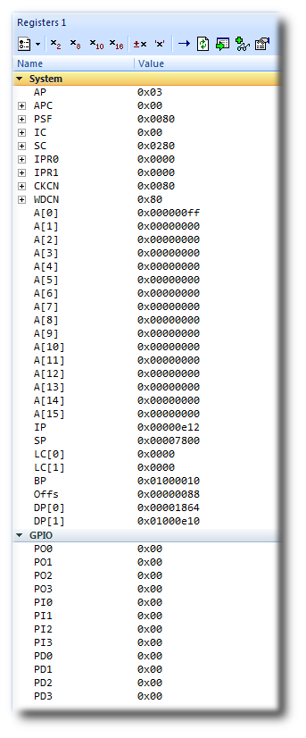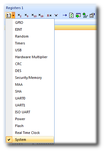 The Registers window can be used to view CPU and peripheral registers. First we shall look at just the CPU registers. To do this, use the Registers 1 window's Register Groups menu to select System.