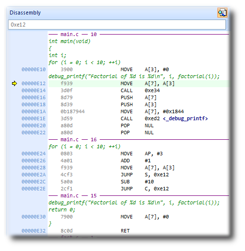 The Disassembly window can be used to debug your program at the instruction level. It displays a disassembly of the instructions around the currently located instruction, interleaved with the source code of the program, if the source is available. When the Disassembly window has focus, all single-stepping is done one instruction at a time. This window also allows you to set breakpoints by clicking in the gutter of lines containing instructions on which you want to set a breakpoint.