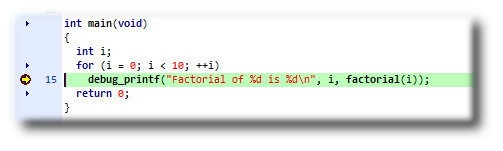 CrossWorks will run a program until it hits a breakpoint. We'll place a breakpoint on the call to debug_printf in main.c. To set the breakpoint, move the cursor to the line containing debug_printf and choose Debug > Toggle Breakpoint or press F9.