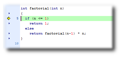 Step into the factorial function by selecting Debug > Step Into, by typing F11, or by clicking the Step Into button on the Debug tool bar.