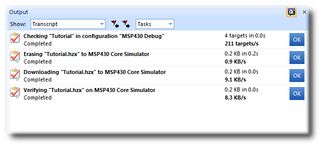 The Tutorial application uses the function debug_printf to output a string to the Debug Terminal in the Output window. The Debug Terminal appears automatically whenever something is written to it—press F5 to continue program execution and you will notice that the Debug Terminal appears. In fact, the program runs forever, writing the same messages over and over again. To pause the program, select Debug > Break or type Ctrl+. (control-period).