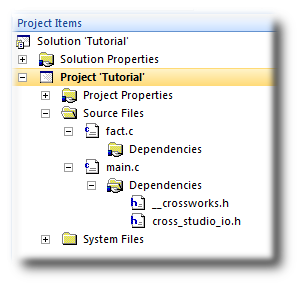 In this case, main.c is dependent upon cross_studio_io.h because it includes it with an #include directive. It is also dependent on __crossworks.h because that is included by cross_studio_io.h. You can open the files in an editor by double-clicking them, so having dependencies turned on is an effective way of navigating to and summarizing the files a source file includes.