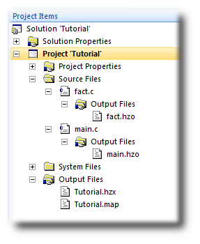 In the above figure, we see that the object files fact.hzo and main.hzo are object files produced by compiling their corresponding source files; the map file Tutorial.map and the linked executable Tutorial.hzx are produced by the linker. As a convenience, double-clicking an object file or a linked executable file in the Project Explorer will open an editor showing the disassembled contents of the file.