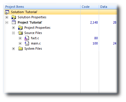 The Code column displays the total code space required for the project. The Data column displays the total data space required. The code and data sizes shown for each C and assembly source file are estimates, but good ones. Because the linker removes any unreferenced code and data, and performs a number of optimizations, the sizes for the linked project may not be the sum of the sizes of each individual file. The code and data sizes for the project, however, are accurate. As already mentioned, your numbers may not match these exactly.
