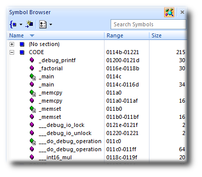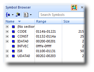 For a more-detailed view of how your application is laid out in memory than the Memory Usage window provides, you can use the Symbol Browser. It allows you to navigate your application, see which data objects and functions have been linked into your application, what their sizes are, which section they are in, and where they are placed in memory.