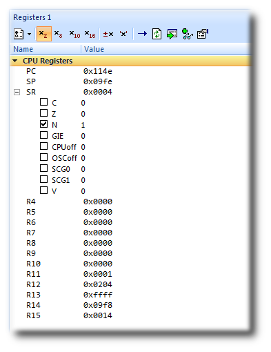 There are four register windows, so you can open and display four sets of CPU and peripheral registers at the same time. You can configure which registers and peripherals to display in the Registers windows individually. As you single-step the program, the contents of the Registers window updates and any change in a register value is highlighted in red.