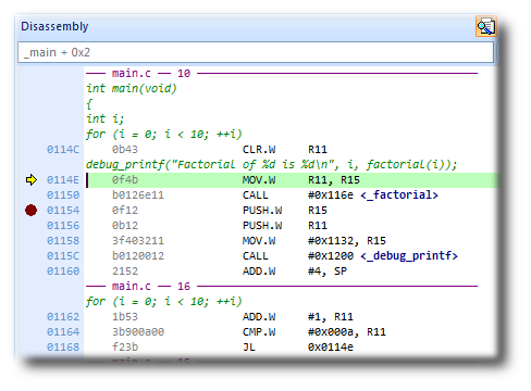 The Disassembly window can be used to debug your program at the instruction level. It displays a disassembly of the instructions around the currently located instruction, interleaved with the source code of the program, if the source is available. When the Disassembly window has focus, all single-stepping is done one instruction at a time. This window also allows you to set breakpoints by clicking in the gutter of lines containing instructions on which you want to set a breakpoint.