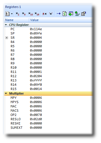 You can also use the registers window to display peripheral registers. To display the state of the target's hardware multiplier registers, select Multiplier from the Register Groups menu.